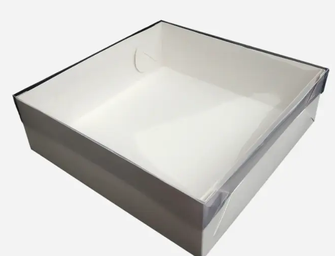 CCaja cuadrada con base blanca o estampada y tapa de PVC. Perfecta para transportar tortas, brinda gran protección y visibilidad, asegurando un traslado seguro.