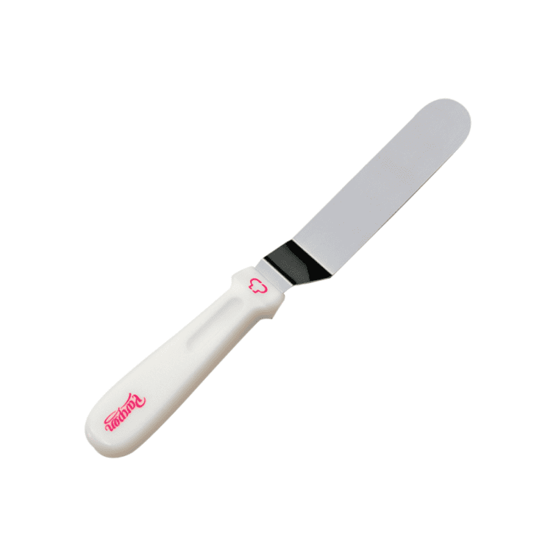 Espátula de acero inoxidable con mango plástico, especial para alisar y rellenar tortas. Permite extender coberturas de ganache o buttercream sobre superficies de galletas, cupcakes y tortas pequeñas. La punta redondeada de la espátula facilita el alisado