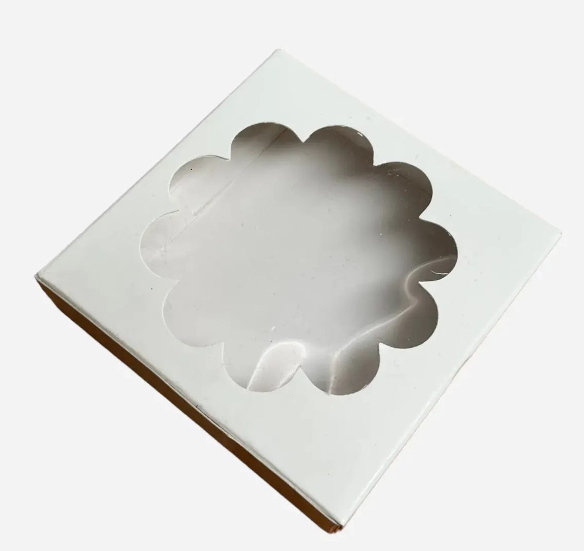 Caja cuadrada en blanca lisa con visor PVC. Pequeña y delicada, ideal para mini cookies, bombones o regalitos personalizados.
