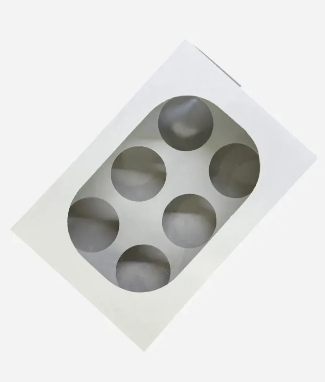 Caja blanca con visor y base extraible para 6 cupcakes de Ø 6 cm. Fabricada en cartulina nacional con tapa bisagra y visor en PVC, es resistente, fácil de armar y perfecta para destacar productos dulces con una presentación prolija y tentadora.