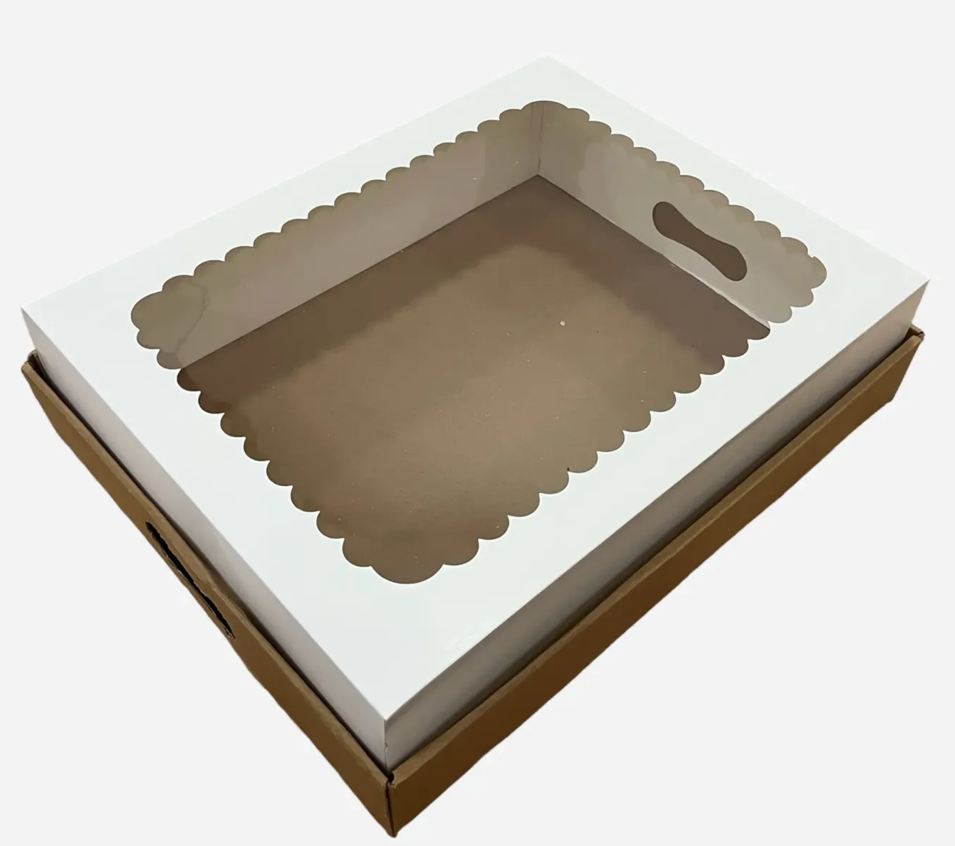 Caja para tortas con base de cartón corrugado y tapa blanca con visor transparente de PVC. Ideal para exhibir y transportar de manera segura y elegante.